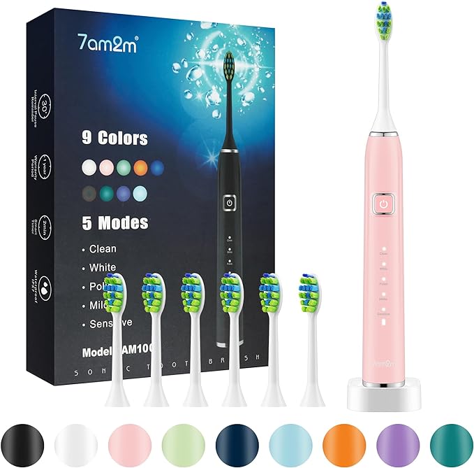 7AM2M Electric Toothbrush with 6 Brush Heads for Adults and Kids, One Charge for 90 Days, 5 Modes with 2 Minutes Build in Smart Timer, IPX7 Waterproof(Rose Pink)