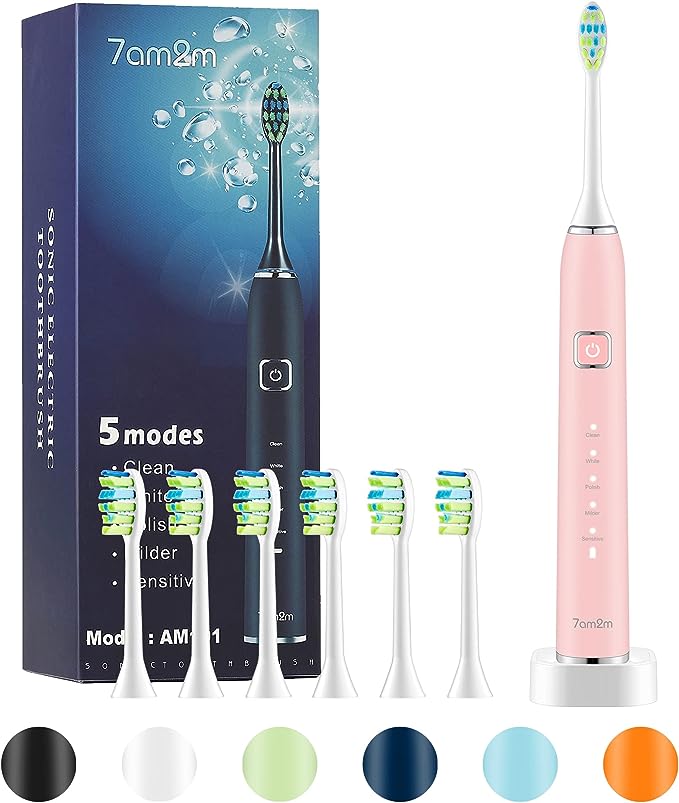 7AM2M Sonic Electric Toothbrush with 6 Brush Heads for Adults and Kids, One Charge for 90 Days, Wireless Fast Charge, 5 Modes with 2 Minutes Built in Smart Timer, Electric…