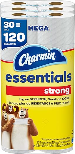 Charmin Essentials Strong Toilet Paper, 30 Mega Rolls = 120 Regular Rolls