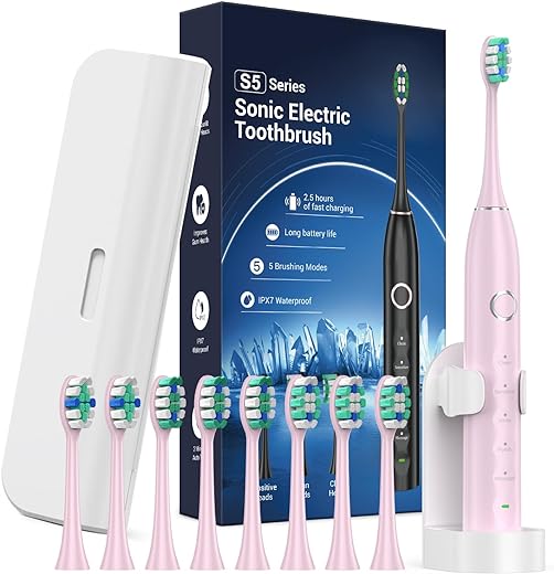 Electric Toothbrush for Adults with 8 Brush Heads, Sonic Toothbrush Rechargeable with a Holder & Travel Case, 2.5 Hours Charge for 120 Days Use – Pink