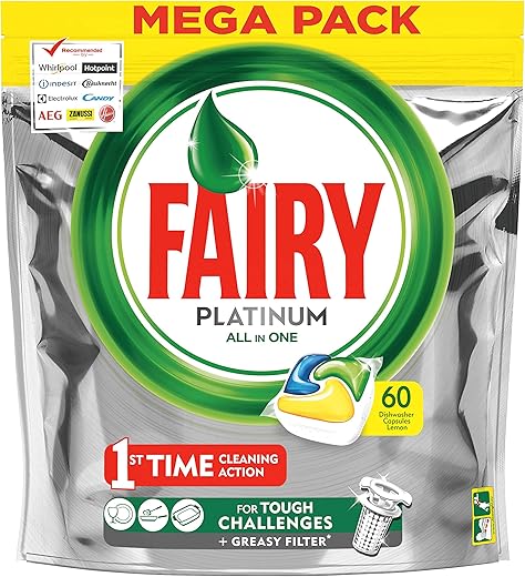 Fairy Platinum 60 Dishwasher Pads, Detergent Pack of 60 Caps, Lemon
