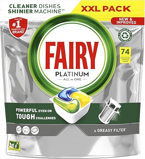 Fairy Platinum All In One Dishwasher Tablets, Lemon, 74 Tablets, For Tough Challenges, Even Cleans Greasy Filters