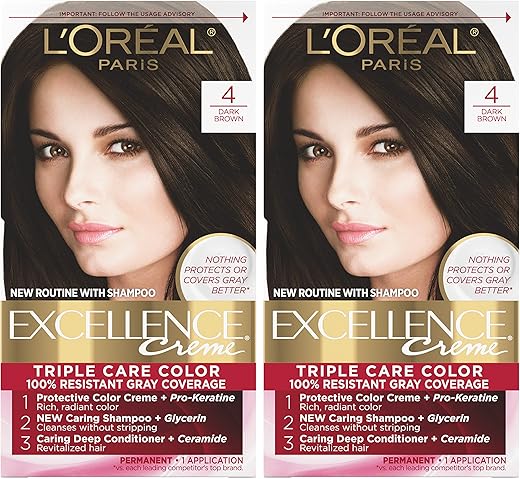 L’Oreal Paris Excellence Creme Permanent Hair Color, 4 Dark Brown, 100 percent Gray Coverage Hair Dye, Pack of 2